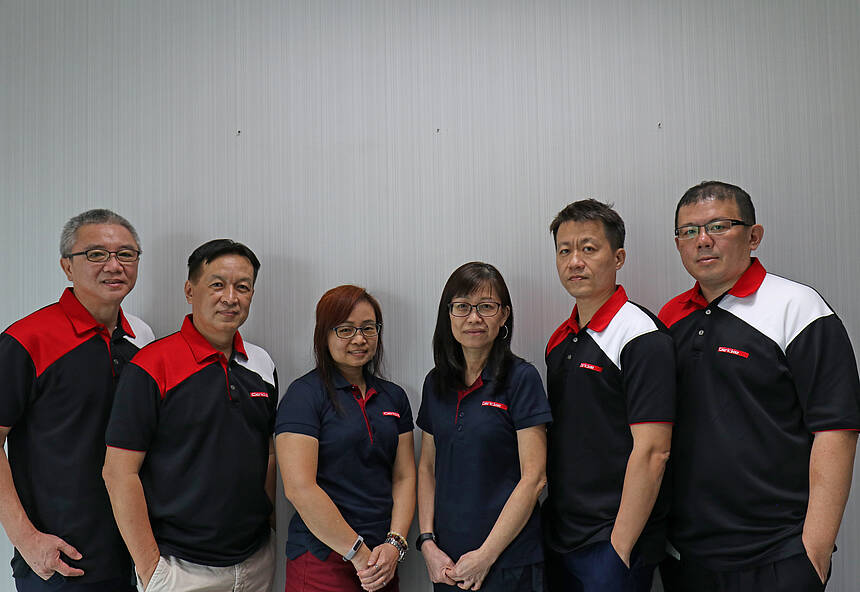 与东南亚最富经验的粉末处理管理团队会面:Andy Chia、Lua Boon Heng、Eunice Lee、Pauline Lim、William Tan 和 Gary Goo。