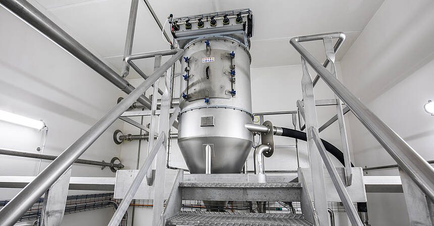 在真空接收器中,气体流经一个过滤器,将固体物质从产品中分离出来。在每个卸料周期中,过滤器都会通过压缩空气自动清洗。
